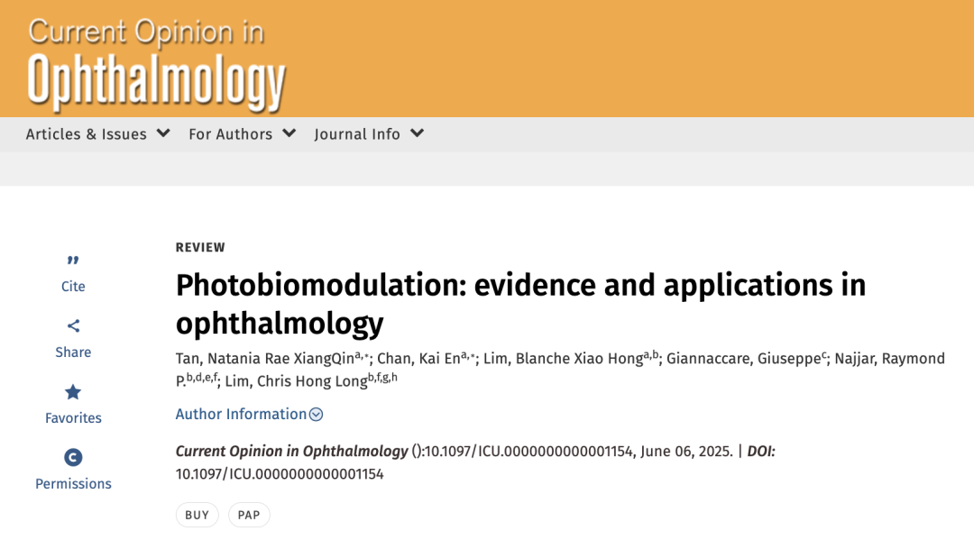 2025年6月6日,「Curr Opin Ophthalmol.」刊发了题为「Photobiomodulation: evidence and applications in ophthalmology」即「光生物调节:眼科的证据和应用」的研究论文。该研究由新加坡眼科研究所、新加坡国立大学 Yong Loo Lin 医学院、新加坡国立大学设计与工程学院生物医学工程系、澳大利亚皇家珀斯医院眼科角膜与眼整形科、意大利卡利亚里大学外科科学系眼科诊所等多机构研究团队联合完成。